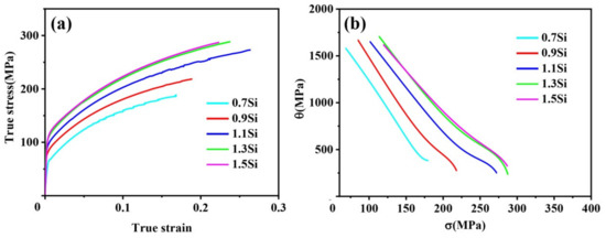 The inhomogeneous deformation in a strip with low Si content limits the full performance of alloy. As the region with the lowest solute concentration, the EBR region has the slowest work-hardening rate, which will lead to excessive slip in this region and accelerate the formation of initial cracks. Figure 5 shows an obvious premature local deformation in the middle of the sample with 0.7 wt% Si, and a large range of slip will be generated. The tensile fracture image of the sample also demonstrates the presence of a large SSP in the middle region, as shown in Figure 8. Increasing the work-hardening capacity of ERRs can inhibit premature crack formation. The uniform plastic deformation section of the true stress and true strain curve was determined, and the derivative of the polynomial fitting was used to obtain the work-hardening response curve that reflects the relationship between the instantaneous hardening rate θ and the flow stress σ in the strips with different Si content, as shown in Figure 12. The increase in the Si content significantly improved the work-hardening ability of the strip. When local strong deformation occurs, the strength of the area will also increase rapidly, such that the deformation will be transferred to other low-strength areas, and the degree of inhomogeneous deformation will be decreased. Both strength and uniform elongation are improved with an increase in Si content from 0.7 wt% to 1.1 wt%. Analysis of the EPMA data shows that increasing the amount of added Si can not only supplement the element content in EBRs but also improve the element distribution uniformity. Along the thickness direction, a range of 100 µm above and below the lowest position of Si content was selected, and the ratios of the maximum and minimum contents were compared. When the Si content increased from 0.7 wt% to 1.1 wt%, the ratio decreased from 1.265 to 1.06, indicating that a more uniform element distribution in EBRs was obtained.
