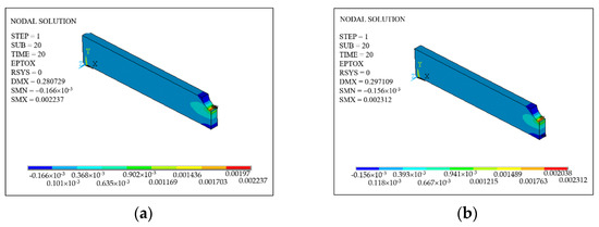 Figure 2 shows the x-direction strain nephogram of the finite element calculation of the notched sheet. It can be seen from Figure 2 that the maximum x-direction strain is located at node 125 or 127 at the center of the notch, whether it is elastic analysis or elastoplastic analysis. The stress and strain values of these two nodes will be taken as the discussion object in the subsequent finite element calculation.