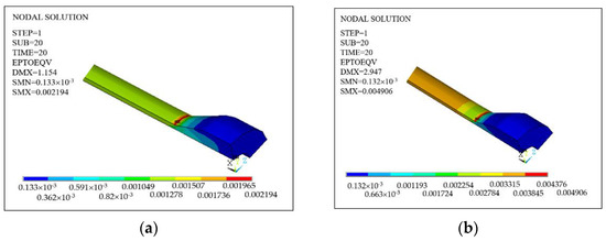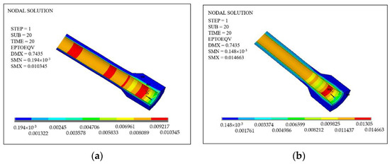Finite element simulated von Mises strain contour of nozzle under mechanical and thermal loads. (a) Elastic analysis; (b) elastoplastic analysis.