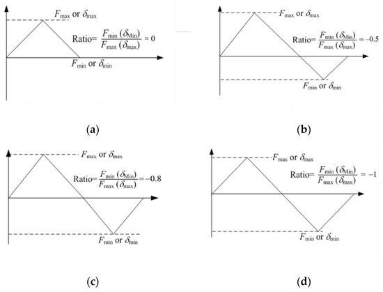 A different ratio to control the loading waveform is selected (see Figure 5), such as in the four cases where the ratio is 0, −0.5, −0.8 and −1. The ratio is equal to the ratio of the minimum load to the maximum load during the cycle. Even under the same load, different results can be obtained by adjusting the ratio.