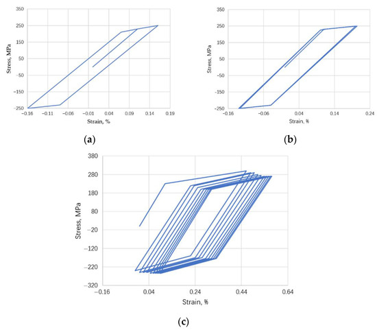 Figure 13 shows the cyclic stress-strain curves of TA16 under stress control. It can be seen from these figures that TA16 has obvious ratcheting behavior. When TA16 is applied to the steam generator, it will bear a cyclic thermal load, which will inevitably lead to the production of ratcheting behavior. The cyclic accumulation of plastic strain occurs in the high stress region of the material, which will lead to structural deformation and damage, and then affect the service life of structures. Therefore, the ratcheting behavior must be reasonably considered in the structural design of titanium alloys.