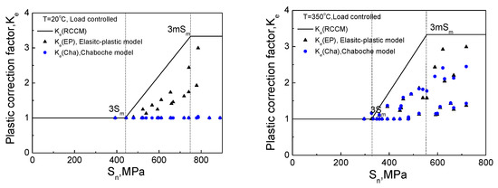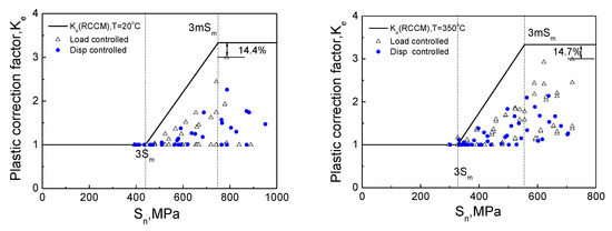 Figure 9 shows the Ke with Se calculated at two temperatures (T = 20 °C and T = 350 °C). It can be seen from the figure that temperature is the key factor affecting the elastoplastic correction factor. Under the same Se, the Ke value calculated at high temperature is much higher than that calculated at room temperature.
