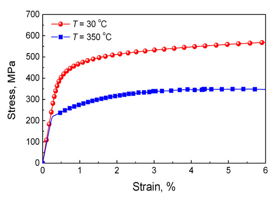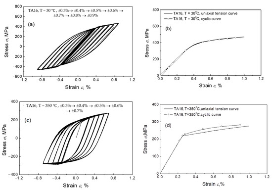 The monotonic tensile test adopts displacement control and the loading rate is 0.02 mm/s. The cyclic test is carried out under two control modes: strain control and stress control. The loading strain rate of the strain control is 0.2%/s, and the loading rate of the stress control is 100 MPa/s. The test equipment is MTS809. Figure 11 shows the uniaxial tensile stress-strain curves of TA16 at 30 °C and 350 °C. Figure 12a,c show the cyclic stress-strain curves of TA16 at different strain amplitudes at 30 °C and 350 °C, showing obvious cyclic stability characteristics. Figure 12b,d show the stable cyclic stress-strain curve of TA16. By comparison with the uniaxial tensile stress-strain curve, it is found that the uniaxial tensile curve of TA16 at 350 °C is slightly lower than that of the stable cyclic stress-strain curve.