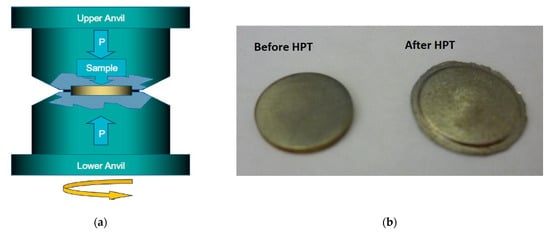 (a) Principle of HPT processing [], (b) disc samples before and after HPT processing. Reprinted with permission from ref. []. Copyright 2022 Elsevier.