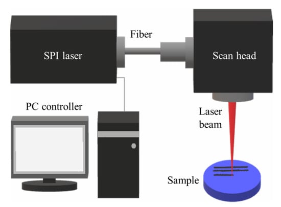The surfaces of the HPT-processed samples were modified by laser surface texturing in an air atmosphere using various scanning speeds, laser powers and holding times in order to evaluate the influence of the various laser processing parameters on the surface roughness and hydrophilic/hydrophobic properties. The laser irradiations were performed on the heat-treated but unstrained samples in air, vacuum and O2 atmospheres. The samples for laser treatment were hand rubbed against the abrasive papers first. Four grades of abrasive papers were used: 800 grit, 1200 grit, 2000 grit and 4000 grit. Then the samples were polished using alumina powder with a particle size of 0.3 μm. Prior to the laser surface texturing, the samples were further polished by alumina to a roughness of ~56 ± 6 nm. The samples were then surface treated using a fiber laser (SPI G3, SPI Lasers, Southampton, UK) with a wavelength of 1064 nm, a repetition rate of 25 kHz, a laser spot size of 40 µm and a pulse duration of >10 ns. The laser texturing process was carried out in power ranges of 0.9–5.0 W and with a scanning speed of 150 mm s−1. Figure 2 shows the configuration of the laser surface treatment system.