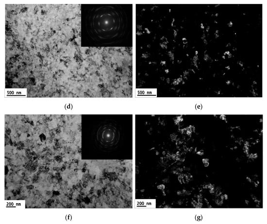 After HPT processing to 1 turn, as shown in Figure 3b,c, in the disc centre area, there remain some coarse grains but the torsional movement is visible because grains began to deform, which is different from the as-annealed CP-Ti sample in Figure 3a, whereas on the disc edge area it is more difficult to see grains under the optical microscope, even at higher magnification because of the heavy shear strain and subsequent grain refinement. The TEM microstructures of CP-Ti after 10 turns and 20 turns HPT processing are shown in Figure 3d–g, which include bright and dark field images. The SAD (selected area diffraction) patterns of 10 turns and 20 turns samples were inserted into the top-right corners in Figure 3d,f, respectively. As such, 10 and 20 turns HPT processing led to the formation of numerous high-angle grain boundaries and ultrafine grains, which are visible in the ring in the relevant SAD patterns. The shapes and sizes of the grains were found to be much easier to recognize in the corresponding dark field images, and from Figure 3e,g, it is clear that most of the ultrafine grains have equiaxed shapes. Further HPT processing, as shown in the TEM images in Figure 3d–g, demonstrate that significant grain refinement was achieved in CP-Ti, with a mean grain size of about 70 ± 18 and 60 ± 12 nm after 10 and 20 turns, respectively.