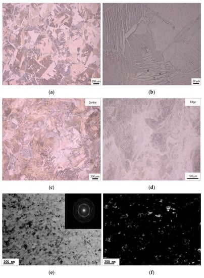 The initial microstructure of the Ti64 alloy after the two-step heat treatment is shown in Figure 4a,b, at two different magnifications, where lamellar (α + β) phases are present within the grains. The microstructure obtained by slow cooling from the β phase field contains individual β plates, separated by the remaining β matrix. In the low-magnification OM image in Figure 4a, there is a coarse grain structure with an average grain size of ~540 µm, whereas in the high-magnification OM image in Figure 4b, lamellar (α + β) phases are clearly visible with α plates in a light colour and β plates in a dark colour, and the thicknesses of the coarse α plates are in the range of ~2–6 μm. Ti64 has an initial hardness value of ~309 Hv for the heat-treated condition. After HPT processing to 1 turn, in the disc centre area, the coarse grains and lamellar structures within grains were deformed but they remain visible in Figure 4c, whereas in the disc edge area, most lamellar (α + β) phases were fragmented and only a small amount of lamellar (α + β) phases remained in sparse areas, but the grain structures are too small to be seen in the optical microscope in Figure 4d. After HPT processing for 10 turns, there was evidence for significant grain refinement, with a mean grain size of about 50 ± 10 nm as shown in Figure 2e,f. The SAD pattern in Figure 4e became ring-like, thereby showing an evolution of grain structures into large numbers of high-angle boundaries.