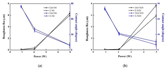 The roughness and contact angle of the CP-Ti and Ti64 samples for (a) N0 and (b) N20 after laser surface modification in an air atmosphere.