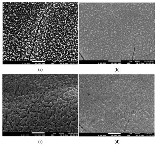 The surface morphologies of the various laser-treated samples were examined using an optical microscope (HRM-300, Huvitz, Gyeonggi-do, Korea). The hydrophilic/hydrophobic properties of the surface-modified samples were investigated by measuring the contact angles of droplets of de-ionized water with volumes of 1 µL. In these experiments the contact angle and roughness were measured three times and the average value was used for comparison purposes. The roughness of the laser-modified samples was measured using an Alpha step profiler (D-300, KLA, Milpitas, CA, USA) with a scanning speed of 0.4 mm s−1, a scan line length of 5 mm and a load of 10 mg. The content of element C was measured using analysis with an Auger electron nanoscope (ULVAC-PHI, PHI 700, Kanagawa, Japan). The laser-treated surfaces were observed over a period from 1 to 27 days in order to fully evaluate the evolution of the surface hydrophilic or hydrophobic characteristics. The surface morphology of laser-modified samples was observed by a field-emission scanning electron microscope (SEM) with model JSM-7600F (JEOL Ltd., Tokyo, Japan). The microstructures of the Ti-6Al-4V alloy and the surface-modified specimens were examined by X-ray Diffractometer (XRD, Bruker D8 Advance, Karlsruhe, Germany). The 2 theta ranges are 20–80 deg and the step mode is 0.03 deg and 0.4 s per step. It should be noted that Cu-Kα radiation (λ = 0.154 nm) at 40 kV and 40 mA was used.
