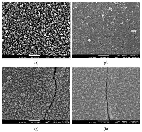 SEM images of the surface observations on laser-modified samples with different holding times (1 day and 14 days) after applying 5 W laser power in air atmosphere (a) CP-Ti N0 sample, 1 day, (b) CP-Ti N0 sample, 14 days, (c) CP-Ti N20 sample, 1 day, (d) CP-Ti N20 sample, 14 days, (e) Ti64 N0 sample, 1 day, (f) Ti64 N0 sample, 14 days (g) Ti64 N20 sample, 1 day, (h) Ti64 N20 sample, 14 days.