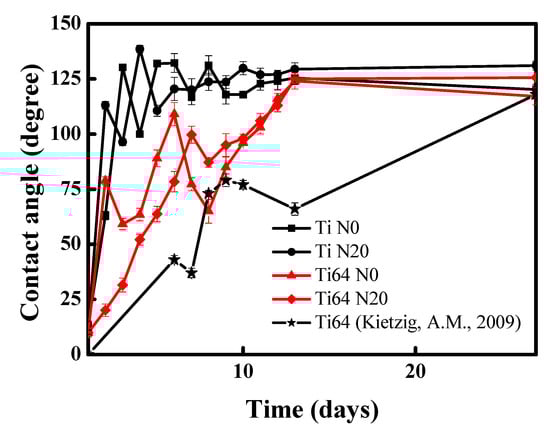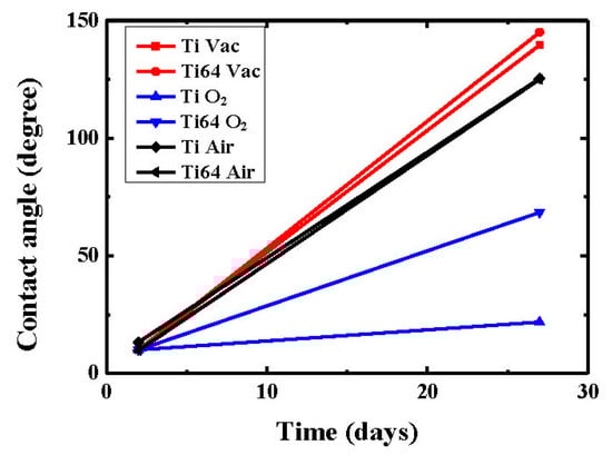 It is important to note that there exists a contact angle difference between laser-treated CP-Ti and Ti64 in the O2 atmosphere after 27 days holding (Figure 10). In general, the higher the surface roughness, the larger the contact angle with increasing holding time. The roughness of the Ti64 N0 sample is higher than for the Ti N0 sample (shown in Figure 6) and, therefore, it is reasonable that the contact angle of the Ti64 N0 sample is larger than for Ti N0 in an O2 atmosphere, as shown in Figure 10. In summary, the contact angles of CP-Ti and Ti64 are smaller than that of CP-Ti and Ti64 samples treated in vacuum and air atmospheres.