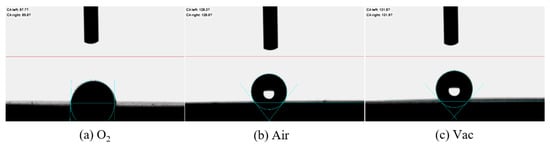 N0 samples of CP-Ti and Ti64 were selected for laser treatment under different atmospheres of vacuum, air and oxygen, with a laser power of 5 W and a scanning speed of 150 mm s−1, in order to evaluate the effect of laser treatment atmosphere on surface modifications. The relationship between the contact angle and the holding time (in days) is shown in Figure 10. It is apparent that the surface contact angle increases with an increase in the holding time and the contact angle of laser-treated samples in a vacuum shows that the samples are more hydrophobic than those laser-treated in the O2 atmosphere. The contact angles of CP-Ti and Ti64 laser treated in a vacuum were 140° and 145°, respectively, after 27 days. By contrast, the contact angles of CP-Ti and Ti64 in the O2 atmosphere after 27 days were only 22° and 68°, respectively. Figure 11 shows the contact angle images for CP-Ti with different atmospheres after 27 days holding time, where it is apparent that laser-treated CP-Ti in an O2 atmosphere has a smaller contact angle than when laser treated in vacuum and air atmospheres. It is necessary to mention that any given atmosphere (air, vacuum and O2) laser treatment and with an increase in the subsequent holding time can lead to a transformation from hydrophilic-to-hydrophobic properties.