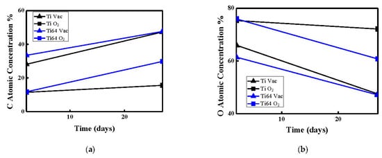 According to the results in Figure 10, it is anticipated that the different atmospheres will produce different carbon and oxygen contents, as a study reported that different wettability was found to be a consequence of changes in surface chemistry []. Therefore, the various samples were examined using Auger electron nanoscope analysis. The relationship between the carbon and oxygen content and the holding time is shown for all samples in Figure 12. In Figure 12a, the variations in the carbon content with holding time is presented for the laser-treated CP-Ti and Ti64 in a vacuum and in an air atmosphere. Thus, when the surface carbon content of the CP-Ti sample is 47% after 27 holding days in Figure 12a, the contact angle reaches 140° (as shown in Figure 10) for laser treatment in the vacuum atmosphere. Comparing the carbon content in Figure 12a with the corresponding contact angles in Figure 10, the result demonstrates that the contact angle increases when the carbon content is higher. By contrast, laser treatment in the oxygen environment leads to a mass production of oxygen, as shown in Figure 12b, and then a reduction in the formation of carbon. In addition, the contact angle in the oxygen environment increases with increasing holding time at a lower rate than recorded in the vacuum or air atmospheres, as shown in Figure 10.