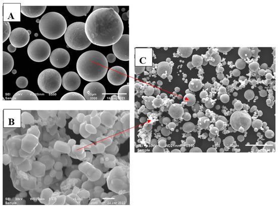 SEM images of the powders: (A) Cp Ti powder, (B) Mo powder, and (C) Ti5Mo powder blend.