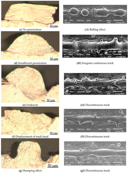 Geometry and morphology of the fused powder tracks at various process parameters, (a) conduction mode: 200 W, 1.0 m/s; (b) deep penetration: 350 W, 1.2 m/s; (c) no penetration: 50 W, 0.4 m/s; (d) insufficient penetration: 150 W, 1.0 m/s; (e) undercut: 300 W, 2.2 m/s; (f) displacement of track head: 350 W, 2.6 m/s; (g) humping effect: 100 W, 1.0 m/s. (a1) Continuous track: 200 W, 1.0 m/s; (b1) Continuous track: 350 W, 1.2 m/s; (c1) Balling effect: 50 W, 0.4 m/s; (d1) Irregular continuous track: 150 W, 1.0 m/s (e1) Discontinuous track: 300 W, 2.2 m/s (f1) Discontinuous track: 350 W, 2.6 m/s; (g1) Discontinuous track: 100 W, 1.0 m/s.