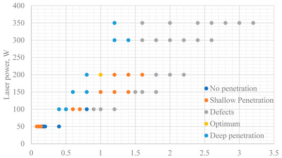 The normalized enthalpy model proposed by Hann et al. [39] further expanded Equation (3) in terms of the spatial intensity distribution of the Gaussian laser beam. Hann et al. [39] assumed that the penetration by the Gaussian laser beam was a function only of the ratio of the deposited energy density to the enthalpy at melting (). King et al. [41] made a very impressive derivation that described the transition from one mode to another more perfectly as compared to the initial derivations based on the normalized enthalpy proposed by Hann et al. [39] for laser welding. According to the King et al. [41] derivation, for a Gaussian beam diameter of d, the maximum temperature of the molten pool could be estimated as: