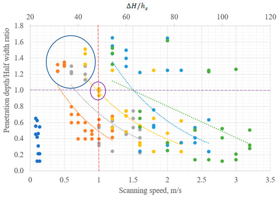 Ratio of penetration depth in relation to scanning speed and normalised enthalpy.