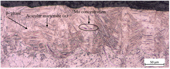 The microstructure of the Ti5Mo layers (Figure 11) is constituted with α and β phases showing as dark-grey varying contrast, acicular martensite and pockets of Mo concentration. The martensitic feature (needle-like structures) is due to the inherent high rate of heating and cooling of the LPBF process. Scipioni et al. [58] reported that the cooling velocity during the LPBF process is greater than 106 K s−1 and the thermal gradient is reported as104 K mm−1 by Shi et al. [59].