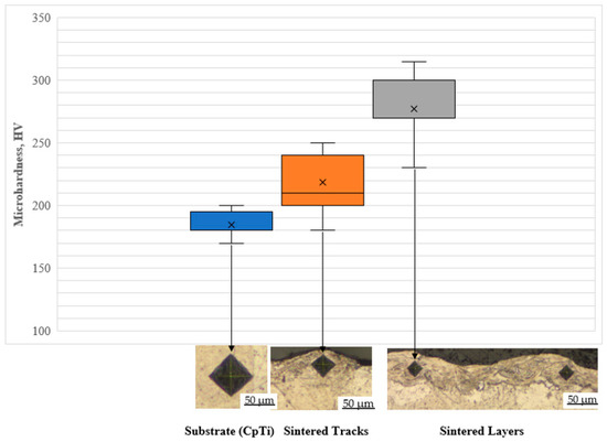 Microhardness values of the Ti5Mo-sintered tracks and layers.