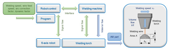 Simplified block diagram of the implemented WAAM cell at the Chemnitz University of Technology; layer width bS and height hS were set indirectly via the welding parameters of welding speed vT and volume flow per time V/t.