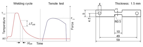 Schematic representation of the test sequence of the thermomechanical simulation (left) and specimen geometry of the sheet specimens used (right).