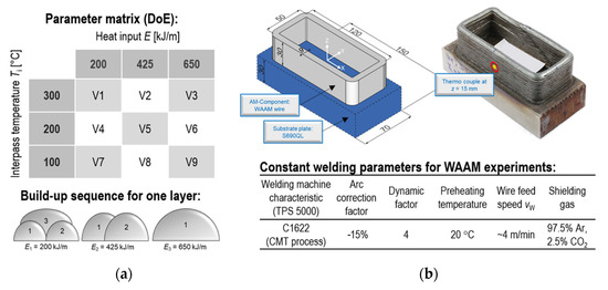(a) Parameter matrix and build-up sequence for 9 mm wide layer for WAAM experiments; (b) specification of the reference geometry (open hollow cuboid): CAD model (left), weld result (right), welding parameters (bottom).