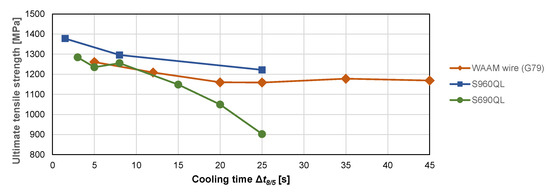 Figure 4 shows the ultimate tensile strength as a function of the cooling time ∆t8/5 for the test materials S690QL, S960QL, and WAAM wire.