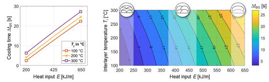 - The heat input had a significant influence on the cooling behavior during layer-by-layer production of the component. High heat input values led to lower cooling rates. The interlayer temperature had a comparatively small effect on the cooling time, and should thus be suitable for adjusting or optimizing in terms of the process time or stress engineering.