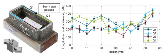 It should be emphasized that the resulting residual stress level on the surface of the top layer was the result of a complex superposition of shrinkage, quenching, and transformation residual stresses according to general concepts, as mentioned above [21]. Other authors investigated these local effects due to high temperature gradients, and found significant influences on the local stress distributions and magnitudes [21], as well as complex interactions with superimposing global welding stresses due to high shrinkage restraints [7]. In comparison to other studies with materials that did not undergo a solid-phase transformation during cooling, which influenced the residual stresses; e.g., [8,20], there was an overall change in the stress equilibrium up to an overall reduction in the residual stresses, which can be specifically utilized, or is already systematically exploited by special material developments [22]. It is therefore important to clarify which of these effects dominates and contributes significantly to the local residual stress formation. This is ultimately reserved for further investigations. For this purpose, areal residual stress analyses on the side walls of the hollow cuboids, as well as exemplary stress analyses in the bulk, are planned.