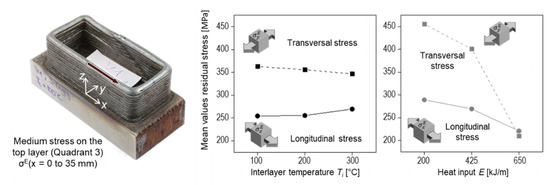 For this purpose, the specimens were divided into four quadrants (Q1 to Q4). The analysis proceeded from the centerline of the specimen (x = 0 mm) to the corners. A constant residual stress level in the middle area of the walls and an increase to approx. 400 MPa of the tensile residual stresses in the corner areas was exhibited that could be traced back to a higher design-related shrinkage restraint corresponding to commonly known models. These results were qualitatively comparable with other studies; e.g., on WAAM of IN718 [8,20]. However, the ratio of yield strength to residual stress was lower here. It was assumed that this was due to compensating transformation residual stresses (formation of compressive loads during cooling process) due to the solid-phase transformation of the high-strength steel weld metal according to generally accepted concepts [16,21]. Another influence on the residual stresses occurred due to the weld start and end points. An increased heat input in quadrants Q1 and Q4 at the weld start and end, respectively, caused elevated residual stresses compared to Q2 and Q3, where constant process conditions prevailed. The mean scatter of the analyzed stress values was ±22 MPa. To determine the influence of the heat input and interlayer temperature on the residual stresses of the surface layers, all nine WAAM-welded hollow cuboids were analyzed in the range of x = 0 mm to x = 35 mm. The mean residual stress level was determined in each case, cf. Figure 6. Figure 7 shows the statistical evaluation of the averaged stress levels from Q3 using regression analysis.
