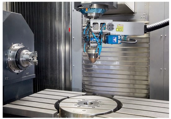 All tests were performed on an IBARMIA ZVH45/1600 Add+Process hybrid machine (Figure 1). This multiprocess machine (Ibarmia, Azkoitia, Spain) combines DED technology with a 5-axis milling and turning (horizontal and vertical) capability. It is equipped with a Precitec YC52 cladding head (Precitec, Gaggenau, Germany), a Sulzer Metco TWIN-10-C Powder Feeder (Oerlikon Metco, Freienbach, Switzerland), and a Yb-Fiber Rofin FL030 3 kW Laser generator (Coherent Rofin, Santa Clara, CA, USA) with a continuous wavelength of 1.07 µm. The hybrid machine was fitted with a 4-stream coaxial discrete nozzle from Precitec.