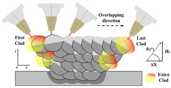 Starting each layer at the same side and employing a zigzag strategy with the opposite direction to the previous layer as the cladding path studied by Kono et al. [30], the first clad is tilted according to the angle of the starting side. The second clad is deposited vertically as a transition clad before tilting the laser head according to the other side angle maintaining this angle until the last clad of the layer (Figure 3). In order to obtain the tool path according to these requirements, the trajectory was programed employing Python software.