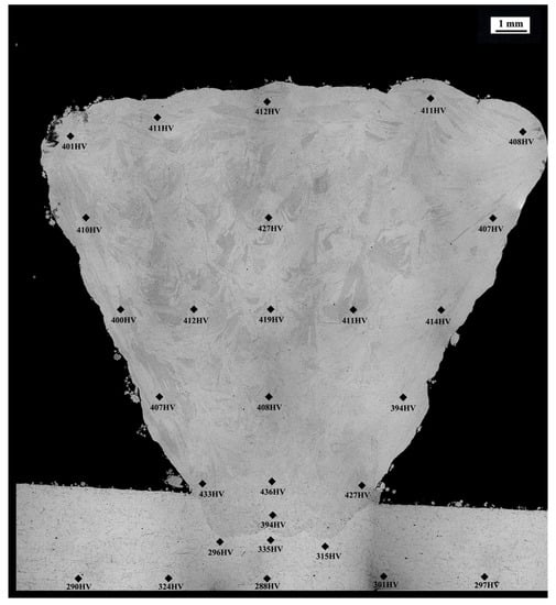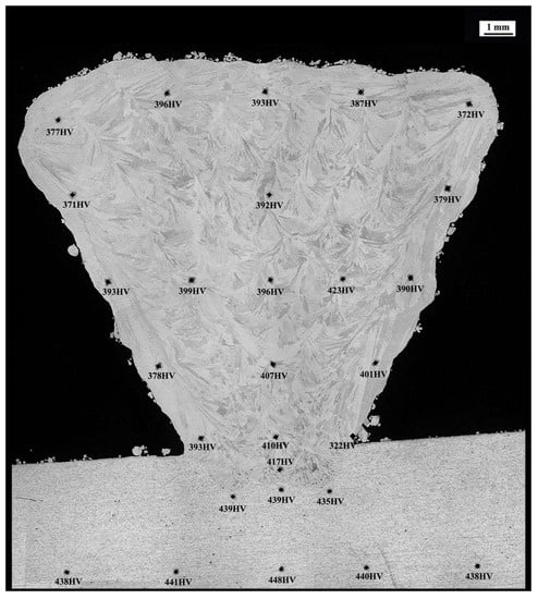 Hardness was measured at different points of the cross sections, both in the deposited material and substrate, resulting in a highest hardness in the core of the deposited cross-section. The mean results are shown in Table 4.