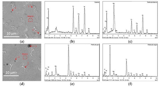 These precipitates presented greater Nb content than the matrix as the δ phase or Nb-rich carbides (Figure 12f), but identification of these small precipitates is complex by SEM since the EDS overlaps with the matrix. In further studies, it would be necessary to employ X-ray Powder Diffraction (XRD) or Transmission electron microscopy (TEM) for the identification of these precipitates.