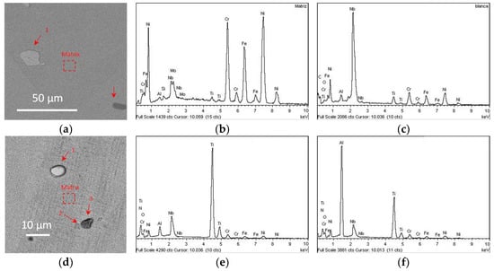 In the as-deposited and direct-aged substrate samples (Figure 12a,d), there were only some disperse grey TiN, black Al-rich oxides and larger-size white Nb-rich carbides (Figure 12). In the case of the Nb-rich carbides, the size obtained in the substrate was larger than 10 µm, meanwhile, in the deposited material were obtained few microns size particles. However, the substrate presented small precipitates in the grain boundaries in contrast to the additively deposited structure.