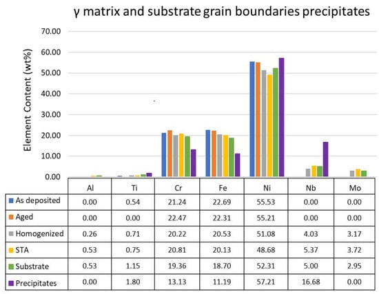 Figure 14 presents the composition of both the deposited and substrate matrix in all samples, and substrate grain boundaries precipitates in the as-deposited and aged samples. As the substrate matrix presented the same element content in all samples, it has been represented by only one value. This analysis is only a semi-quantitative presentation without further standardization.