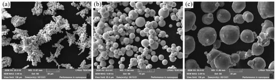 The shape of the powder materials is shown in Figure 1. Zn and Al particles were nearly spherical, and Cu particles were dendrite. The spherical particles had higher fluidity and less anisotropy than the dendritic particles, but due to the rough structure, the dendritic particles were more likely to reach higher velocities during the spraying [19]. High-impact velocity could promote the deformation of the particles and achieve an enhanced bond in the deposition.