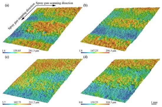 Figure 3. Three-dimensional (3D) profile of the coatings: (a) coating 1, (b) coating 2, (c) coating 3, and (d) coating 4.