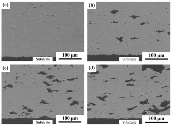 Figure 4. Microstructure of coating cross-section: (a) coating 1, (b) coating 2, (c) coating 3, and (d) coating 4.