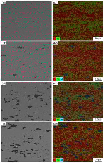 Figure 4 and Figure 5 illustrate the microstructure and element distribution of the cross-section of the coatings. The porosities of coatings 1–4 were 0.98%, 1.21%, 1.07%, and 0.68%, respectively, indicating that the coatings prepared in this experiment could be considered as dense. Meanwhile, no penetration holes were found in the coating cross-section, suggesting that the coatings could provide effective protection for the substrates. In addition, it can be seen from the EDS results that the distribution of Zn particles was relatively dispersed, while the Al particles were moderately concentrated due to the larger particles.