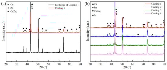 The XDR pattern of coating 1 and its feedstock are shown in Figure 6a. Compared with the feedstock particles, the diffraction peaks of CuZn5 were observed in the prepared coating due to the fact that the energy from high-speed impact in the cold spray process reconstructed the boundaries of Cu and Zn particles, leading to the production of intermetallic compounds [31]. The XRD results of all coatings are presented in Figure 6b. No oxides of the feedstock particles were found, which further proved that the cold spray technology is suitable for the deposition of easily oxidizable materials.