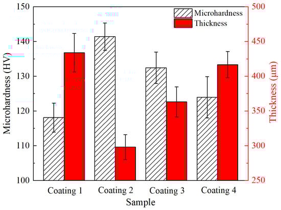 Figure 7. Thickness and microhardness of the cold-sprayed coatings.
