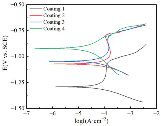 The potentiodynamic polarization curves of the coatings at the initial immersion stage are presented in Figure 8. The polarization curves were fitted with the electrochemical workstation analysis software to obtain the Ic of the coatings at the beginning of immersion, as shown in Table 5. Ic showed a trend of rising first and then falling. After Al was added, only the Ic of coating 4 was lower than that of coating 1. This phenomenon showed that Ic was not only related to the coating composition but also to other properties of the coatings. The above analysis indicated that denser structure could reduce the corrosion rate of the coatings when corrosion occurred. More surface defects led to the increase in surface activation sites of coatings 2 and 3, and the reaction between the working solution and the coating samples was more intense.