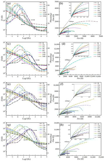 Figure 9. Bode and Nyquist diagrams of different coatings during the immersion period: (a,b) coating 1, (c,d) coating 2, (e,f) coating 3, and (g,h) coating 4.