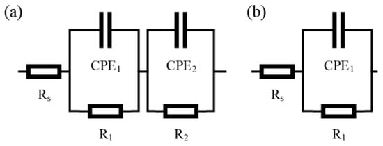 Figure 10. Equivalent circuit of coatings: (a) R(QR)(QR) circuit and (b) R(QR) circuit.