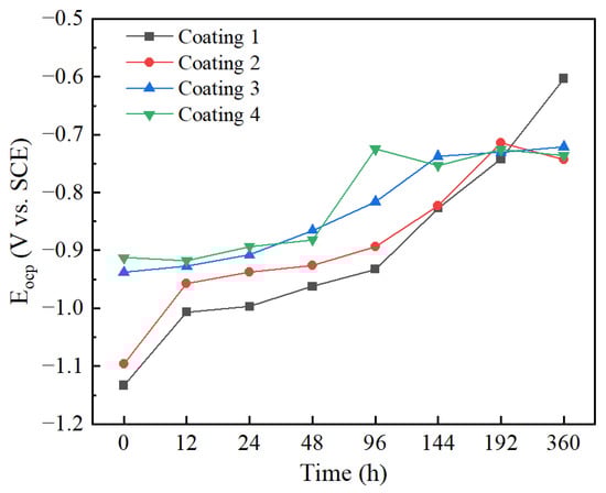 The coatings were tested for OCP monitoring to investigate whether the coating reached a stable corrosion state, and the results are shown in Figure 11. The OCP values of all cold spray coatings showed an upward trend in the early stage of immersion due to the penetration of electrolyte into coating defects. When there were sufficient corrosion products to compensate for coating defects, the OCP of the coatings would be in a stable state [34]. As shown in Figure 11, coatings 2–4 were finally stabilized at approximately −730 mV/SCE during the immersion, and as the coating element content changed, the time required to reach a stable state was continuously shortened. However, the OCP of coating 1 was still rising. Combination of the results of the EIS and OCP experiments showed that during the entire immersion process, coating 1 failed to reach a stable corrosion state, and the solution continued to invade the interior of the coating. Although the Re of Coating 1 increased throughout the soaking process, it remained relatively low after soaking for 360 h. On the contrary, after 360 h of immersion, the coatings with Al entered the resistance stabilization stage and could continue to provide long-term stable protection for the substrate. In addition, on the whole, after the addition of Al element, the Re of the coating during the immersion was higher than that of coating 1. Moreover, although the surface Re of the coatings in the corrosion stable state varied greatly, it remained at a high level.