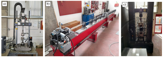 Testing equipment for experiments: (a) Hydraulic machine for slower dynamic tests, (b) SHTB for faster dynamic tests, and (c) motor-driven machine with climatic chamber for static tests at different temperatures.