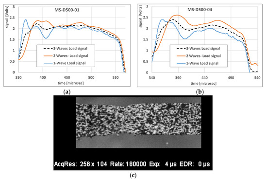 Load histories according to the one-wave, two-wave and three-wave procedures of MS1700-D500-01 (a) and 04 (b) dynamic SHTB tests. Typical frame at incipient failure from a dynamic test (c).