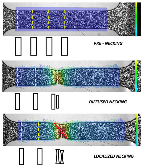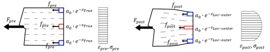 Therefore, the knowledge of local strains delivers the current size of each shrunken sub-area at each stage of a tensile test. Before necking onset, the plastic strains of all sub-areas are equal to each other and to , while after necking onset, varies along the width, with a peak at the center ( and lower values at the outer neck points (). Then, after necking onset, the sub-area at the neck center becomes smaller than the sub-areas at the outer sides of the neck section, as illustrated in Figure 8.