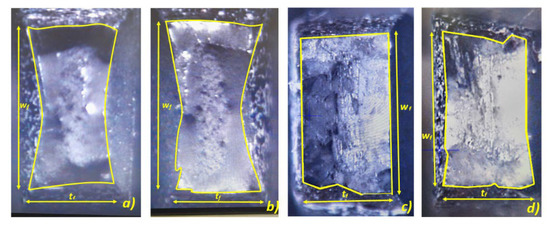 The width and thickness of the failed specimens of the DP1000 and MS1700 steels investigated in this work, optically measured as in Figure 6, confirm that a remarkable constancy of the ratio is preserved until failure, despite the localized necking possibly causing a progressive distortion of the edges of the cross-section on the necked zone, as also visible in the same figure.
